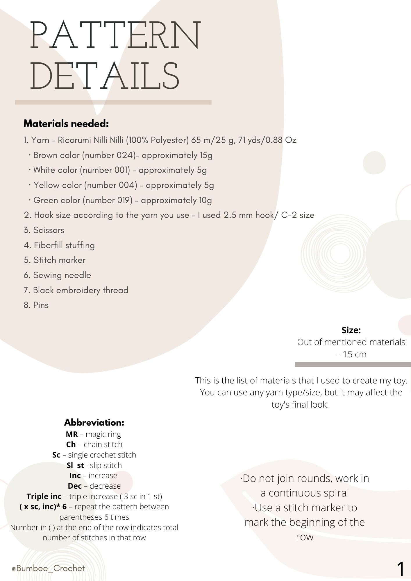 For this pattern, I used acrylic yarn Ricorumi Nilli Nilli (100% Polyester), 65m / 25g and a 2.5 mm hook (C-2). You can use any yarn of your choice.